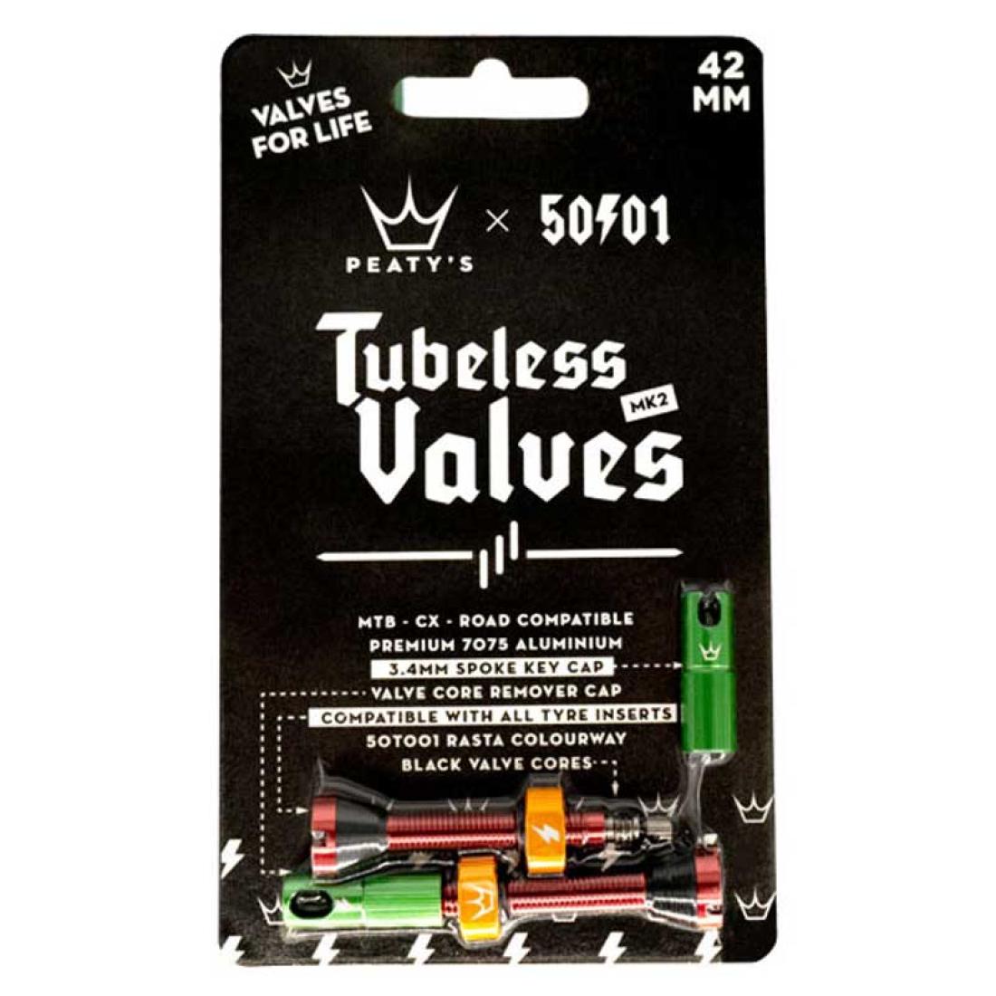 Peaty's x 50to01 MK2 Tubeless Valves са висококачествени вентили, изработени от лека и здрава 7075 алуминиева сплав. С дължина от 42 мм и специален "Rasta" дизайн, те са съвместими с повечето безкамерни системи - от планински велосипеди (MTB) до шосейни и циклокрос модели. Тези вентили са перфектното решение за карбонови, ендуро и DH джанти.