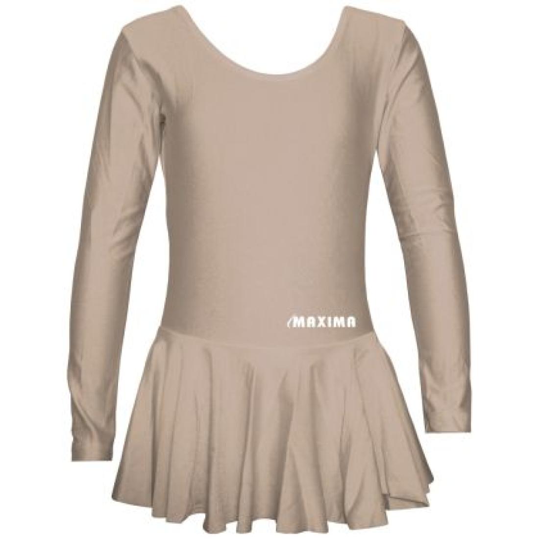 Открийте перфектната комбинация от стил и удобство с детското трико с дълъг ръкав и пришита поличка MAXIMA в неутрален бежов цвят. Този модел тип "рокля" е мечтаното решение за родители и треньори, тъй като предлага завършена сценична визия без необходимост от закупуване на допълнителни части. Бежовият (телесен) нюанс е изключително актуален в съвременния танц и лиричния балет, тъй като удължава визуално линиите на тялото и придава усещане за лекота и ефирност.
