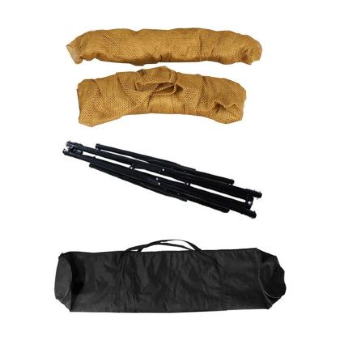 - Конструкция: Сгъваема метална стойка (260х75х100 см) + дървени рейки